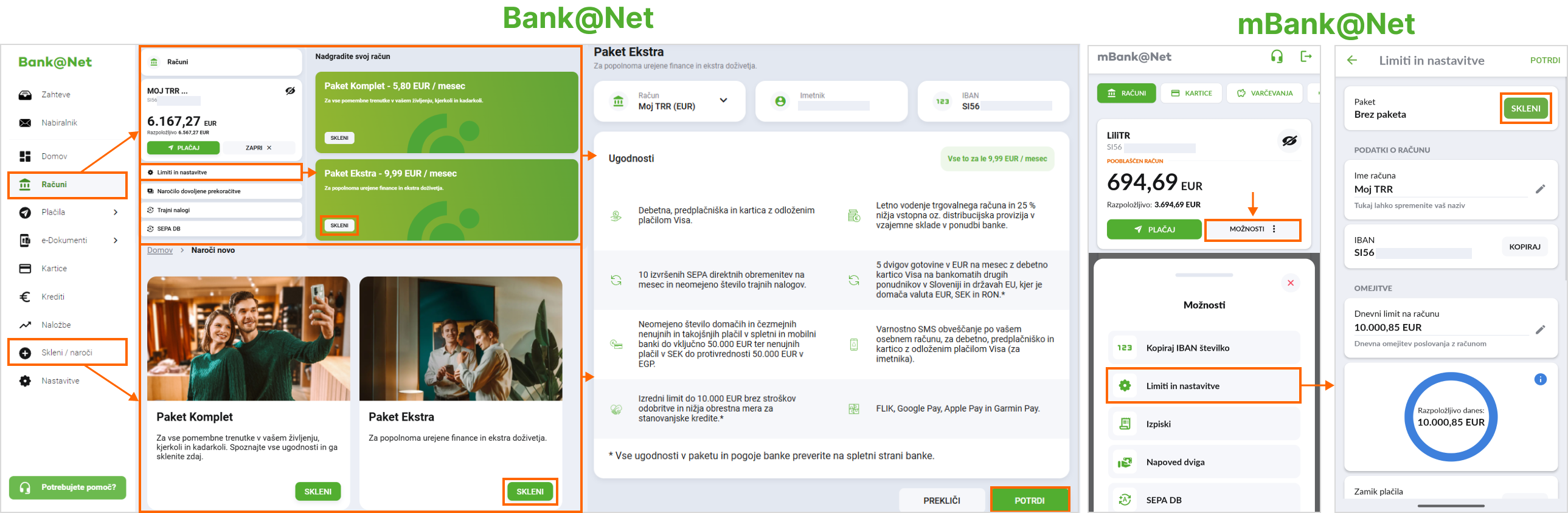 - V spletni banki pri izbranem računu izberite Možnosti ter Limiti in nastavitve ali v meniju izberite Skleni / Naroči. Nato kliknite Skleni na želenem paketu in potrdite svojo izbiro.