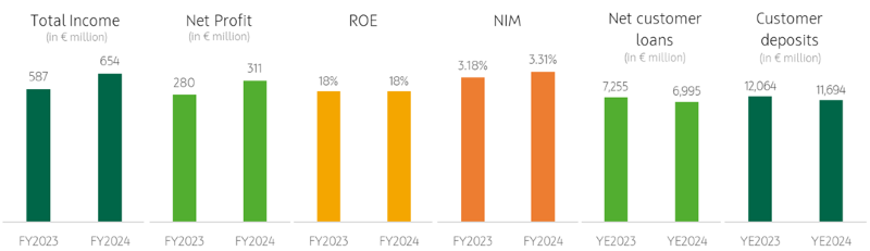 Net interest income for the Group amounted to €494.2 million in FY 2024, an increase of 3.8% compared to FY 2023, while OTP banka’s net interest income amounted to €480.6 million. The net interest margin of the Group rose to 3.31% in FY 2024, compared with 3.18% in FY 2023.