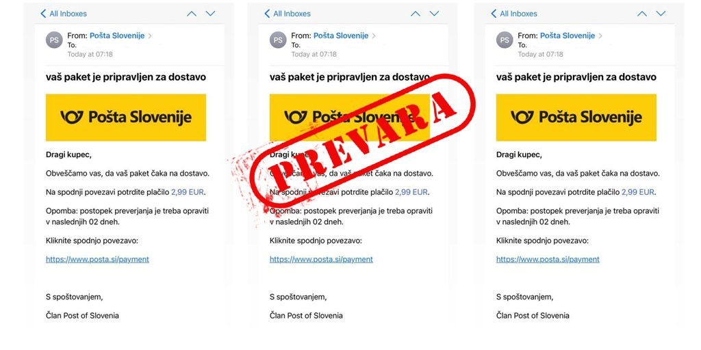 - stranka prejme lažno elektronsko pošto, v kateri jo je ''Pošta Slovenije'' obvestila, da njen paket čaka na dostavo in da mora plačati le še stroške dostave.