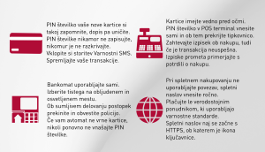 Priporočamo vam uporabo naše storitve Varnostno SMS sporočilo, ki vam omogoča, da prejmete SMS ob plačilu, ki ga izvedete doma ali v tujini, preko spleta ali telefona ter ob dvigih na bankomatih. Z Varnostnim SMS-sporočilom imate nadzor nad porabo s plačilnimi karticami, ob poskusu zlorabe kartice pa lahko nemudoma ukrepate.
