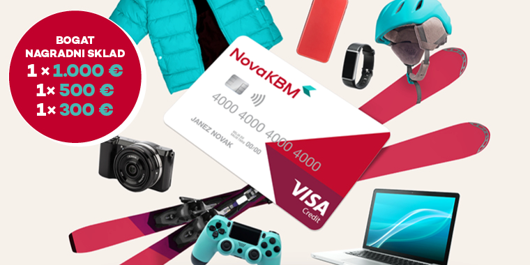 Do 31. 3. 2022 se z vsakim obročnim nakupom s kartico Visa Nove KBM z odloženim plačilom uvrstite v žreb za glavno nagrado 1.000 EUR ter stranski nagradi 500 EUR in 300 EUR. Štejejo vsi nakupi v trgovinah, na spletu in v tujini. Več nakupov, ki jih razdelite na obroke, pomeni večjo možnost za osvojitev nagrade.